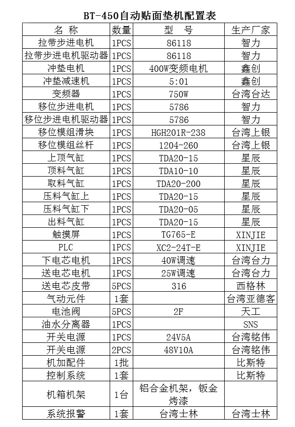 三、BT-450自動(dòng)貼面墊機(jī)配置表